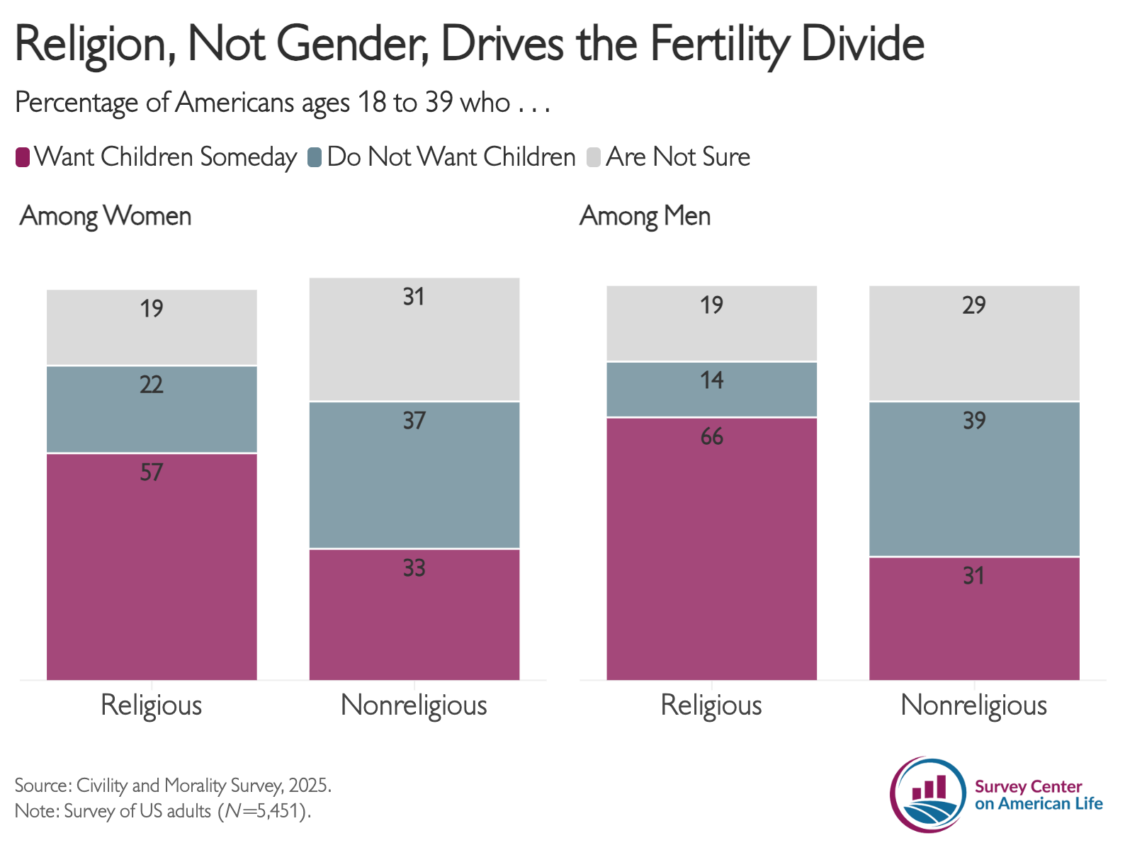 While childless women are more often criticized for their choices, many men appear similarly hesitant to start families. Secular men and women under age 40 have nearly identical preferences when it comes to parenthood. About one in three nonreligious women (33 percent) and men (31 percent) report that they want to have children someday. The gender gap only emerges among religious Americans. A majority (57 percent) of religious women say they want to have children at some point in their lives, compared to nearly two-thirds (66 percent) of religious men.1