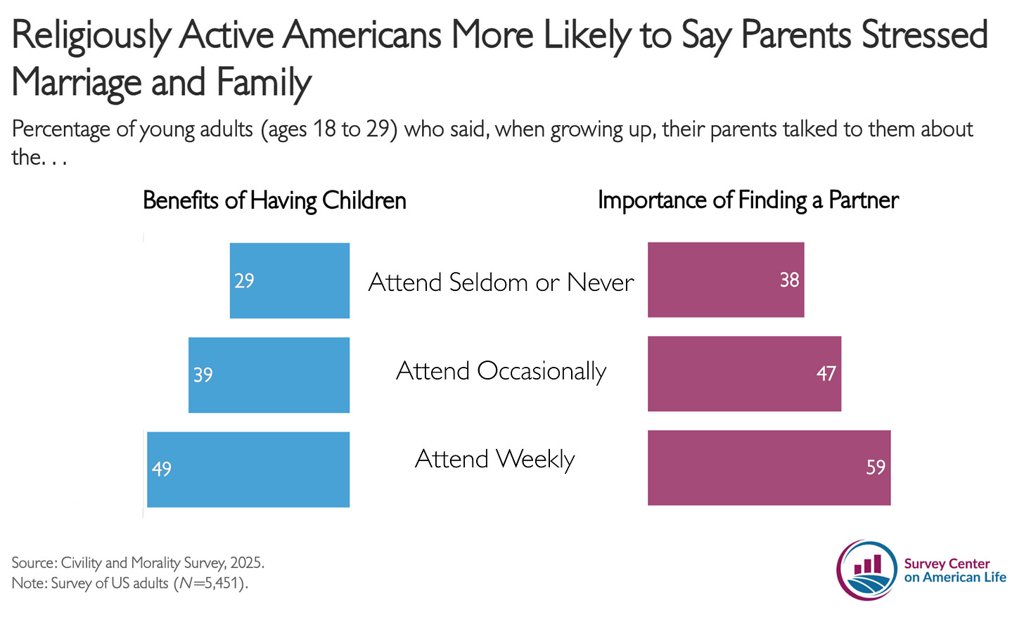 The reason religious people have more children than their nonreligious peers is not especially difficult to discern—they tend to be embedded in social contexts that prioritize marriage and parenthood. Young adults raised in religious households are more likely to report that their parents stressed the importance of marriage. Fifty-nine percent of young adults who attend religious services weekly say their parents talked at least occasionally about the importance of finding a partner or getting married. Only 38 percent of young adults who seldom or never attend religious services had the same experience.