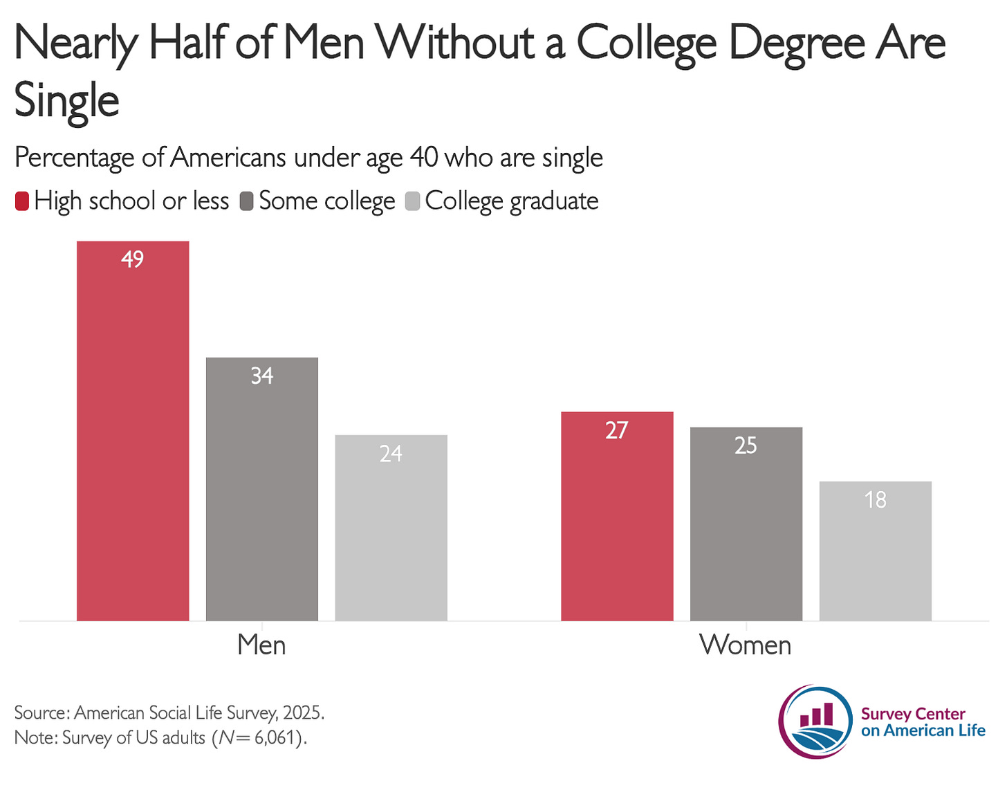 But there’s another group who fares far worse on the dating market, even if their voices are not often represented in The New York Times. Nearly half (49 percent) of men under the age of 40 with no college experience are romantically unattached.1 They do not have a spouse, a long-term partner, or a girlfriend. This stands in stark contrast to their female peers. Only 27 percent of noncollege women are single, and even fewer (18 percent) college-educated women are single.