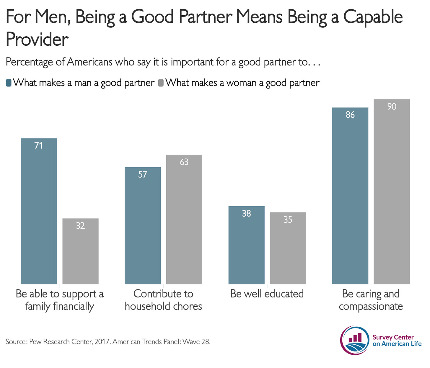 Another Pew study found that evaluations of what makes someone a good partner are nearly identical for men and women, except for one criterion: ability to financially support a family. Seventy-one percent of Americans say the ability to support a family is a critical component of male partnership, but only 32 percent say the same of women. Importantly, views of men and women have nearly identical views when it comes to evaluating men—the ability to provide financially remains inextricably linked to partner quality.